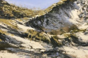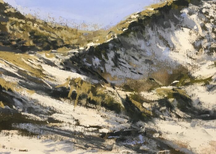 Bilder in Pastelltechnik werden in der Regel durch Übereinanderlegen von mehreren Farbschichten aufgebaut, um eine naturalistische Farbgebung herzustellen. Es geht aber auch anders: Wir können die Vorteile der Pastelle – direkter Farbauftrag, kein langwieriges Mischen der Farben vorab oder auch ihre zeichnerischen Möglichkeiten – nutzen, um locker und gestisch Komposition und Dynamik einer Landschaft herauszuarbeiten.